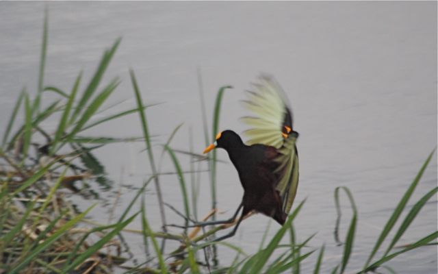 Jacanas are completely amazing birds, especially in flight. They unfurl those chartreuse wings and you immediately think WHAT THE HECK IS THAT?? I would love to know the adaptive significance of chartreuse wings. I guess it's a social signaling thing, to be seen at great distances over marsh grass? It makes me wonder if jacanas taste awful, because they're so darned obvious and would seem to be such easy prey for an aerial predator, for instance. Has anyone ever seen anything eating a jacana? Crocs and gators and caimans, no doubt.