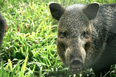 Next, I call to the captive javelinas, the little wild pigs that root and trot through the forests. Technically, they're collared peccaries Pecari tajacu, and they aren't actually in the Suidae but in their own family, the Tayassuidae. They've got fabulous long oily hair, which acts as a water-repellent raincoat in their wet lush habitat.